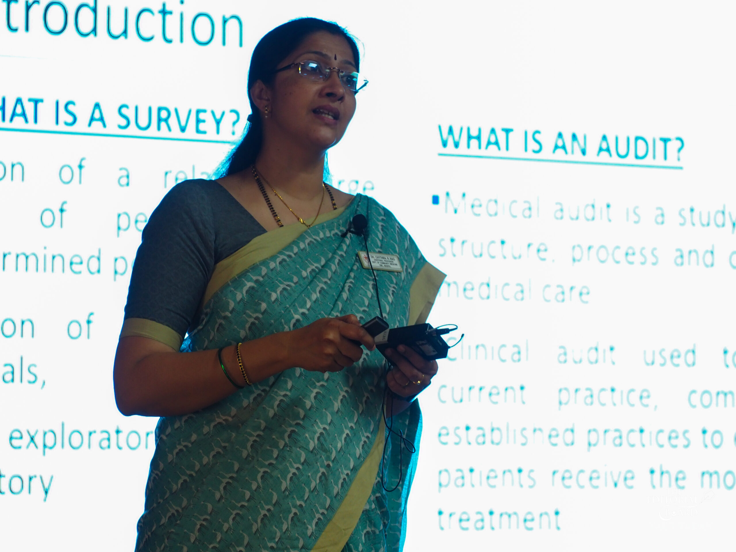 Dr. Chythra Rao spoke about ‘Conducting a survey and audit’. Telling the students how to develop a survey research question and about the survey methods – descriptive and longitudinal with examples. Dr. Rao taught how to make a survey questionnaire for each method and how to make the questions high yielding. She also talked about the methods of survey administration and methods of sample selection.